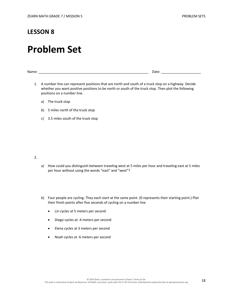 2b. Four people are cycling. They each start at the same point. (0 represents their starting point.) Plot their finish points after 5 seconds of cycling on a number line.