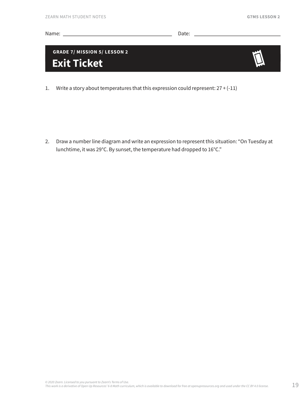 Exit Ticket2. Draw a number line diagram and write an expression to represent this situation: "On Tuesday at lunchtime, it was 29 deg C. By sunset, the temperature had dropped to 16 deg C."