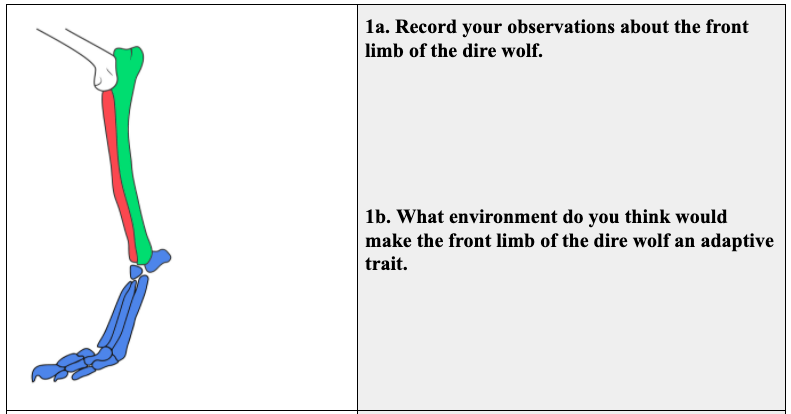 Part 1: Observing Species’ Front Limbs Record your careful observations of the zoomed-in illustrations of front limbs for the dire wolf, the fruit bat, and Titanotylopus