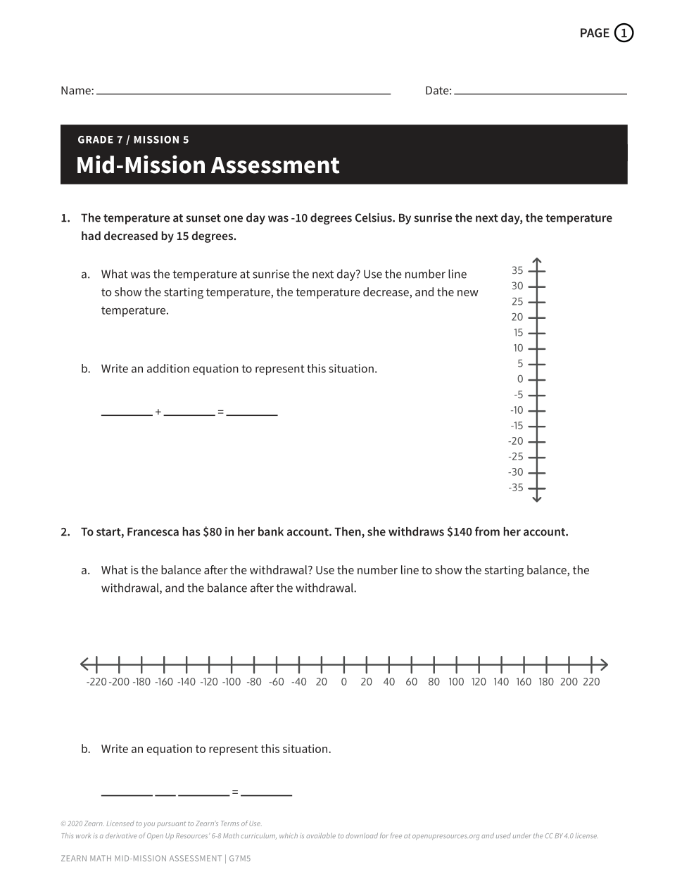 1. The temperature at sunset one day was -10 deg C. By sunrise the next day, the temp had decreased by 15 degrees. 1 pt for correct answer1 pt for writing on the number line to show the situation1 pt for addition equation in part b