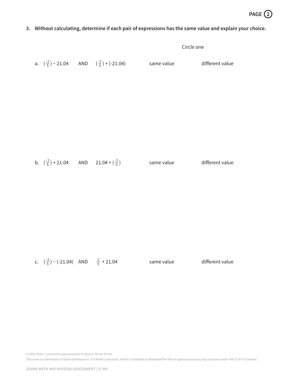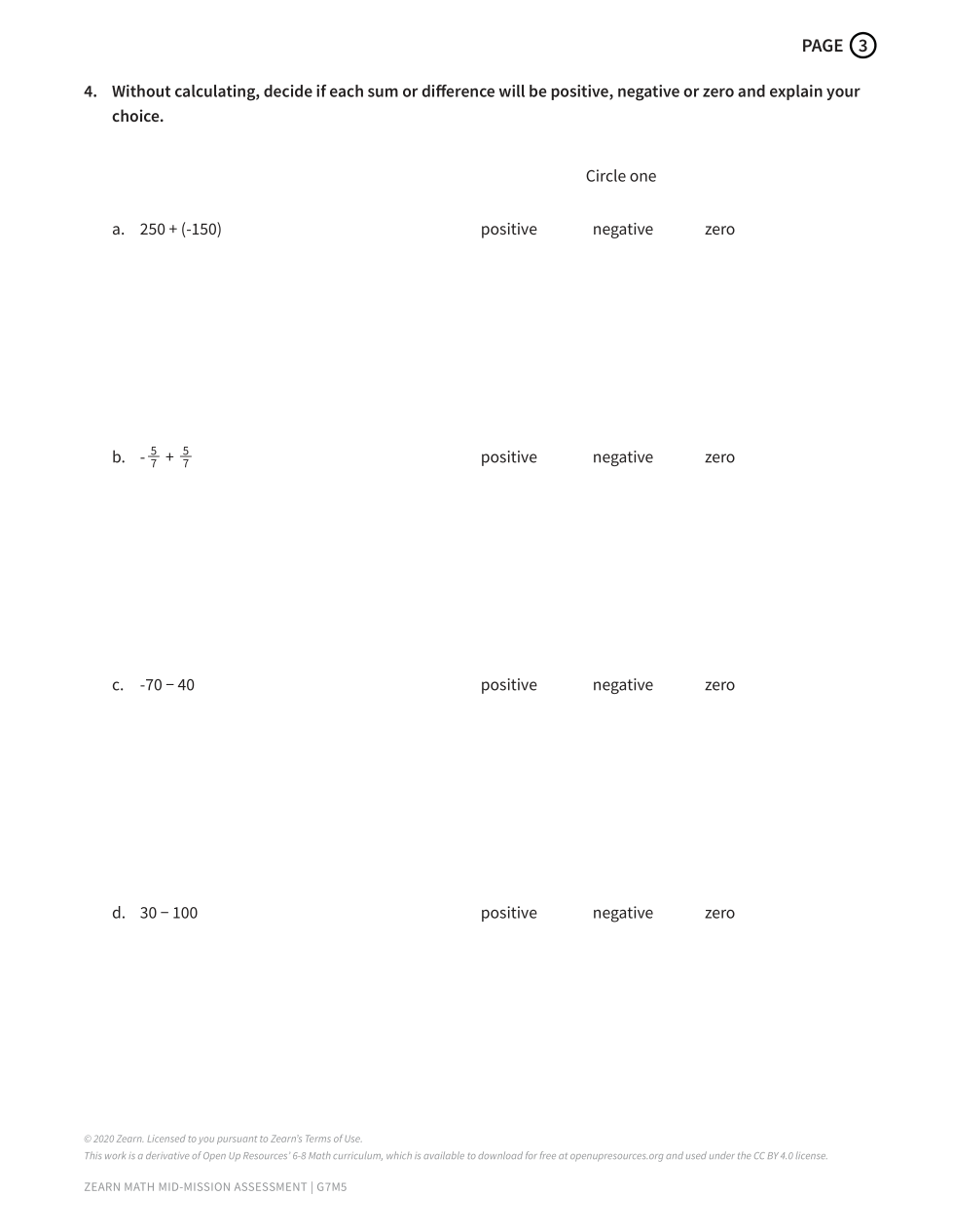 4. Without calculating, decide if each sum or difference will be positive, negative, or zero and explain your choice. c) 1 pt for choosing the correct answer1 pt for showing or explaining your reasoning