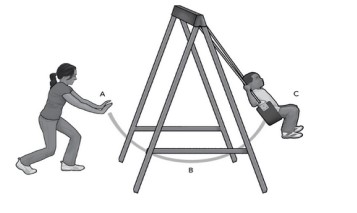 Joanna took her little brother to the playground because he likes to swing. Look at the diagram below that shows Johanna pushing her brother on a swing. Which statement is true about the transformation between kinetic and potential energy while the boy swings?