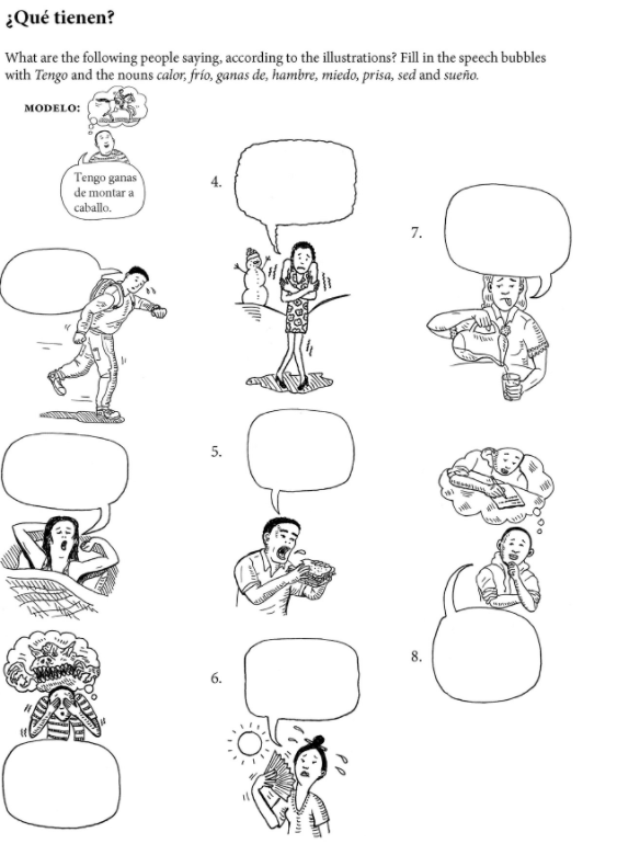 What are the following people saying, according to the illustrations? Fill in the speech bubbles with tengo and the nouns: calor, frio, ganas de, hambre, miedo, prisa, sed, and sueño.