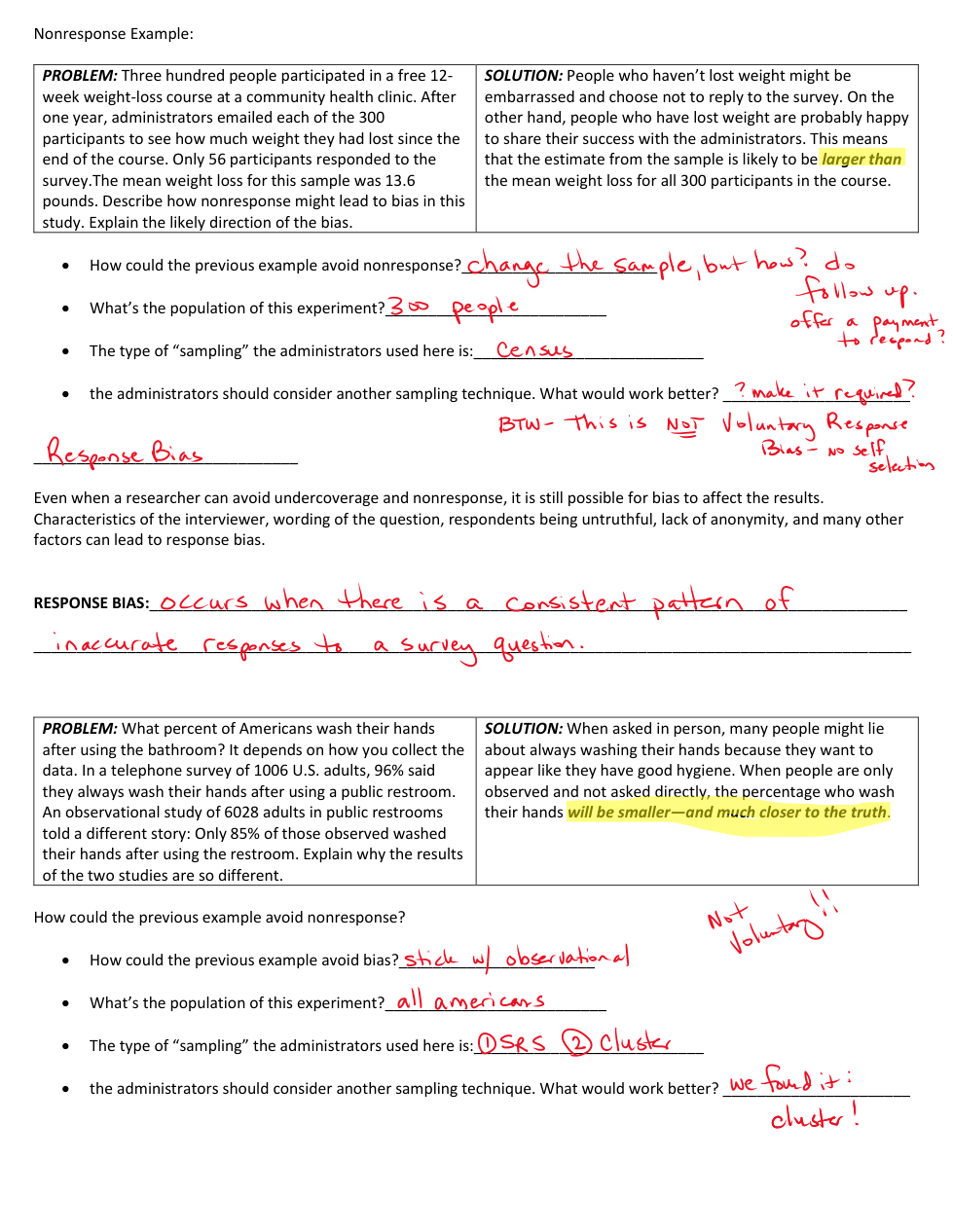 Marcos asked a random sample of 50 mall shoppers for their weight. Twenty-five of the shoppers were asked directly and the other 25 were asked anonymously by means of a “secret ballot.” The average reported weight was 13 pounds heavier for the anonymous group.