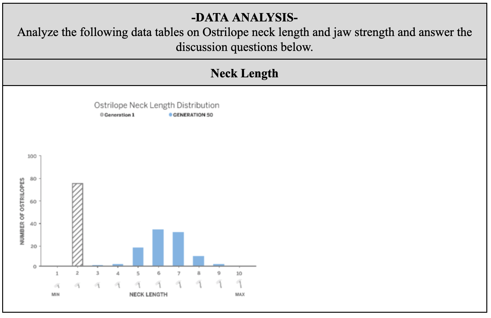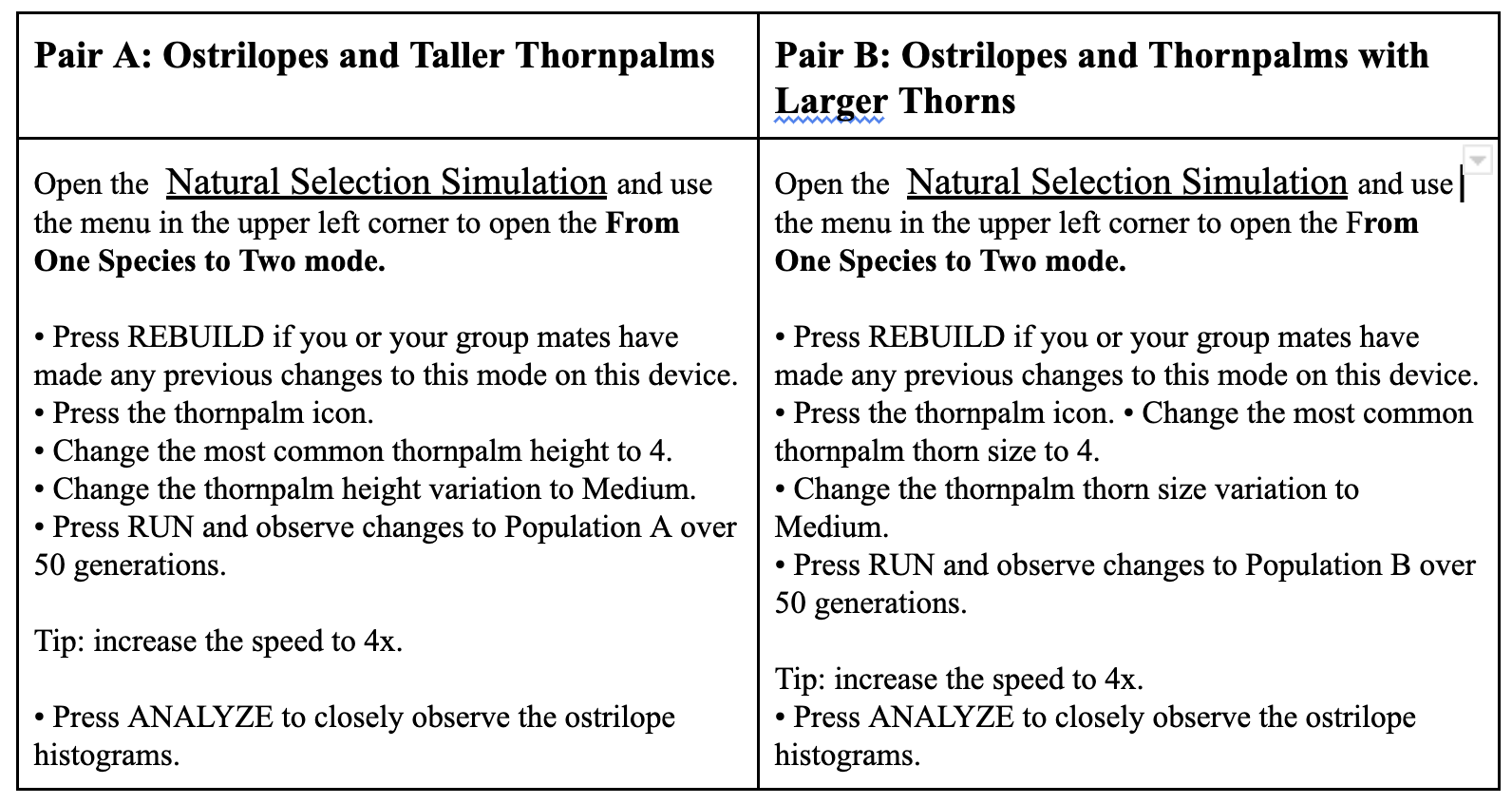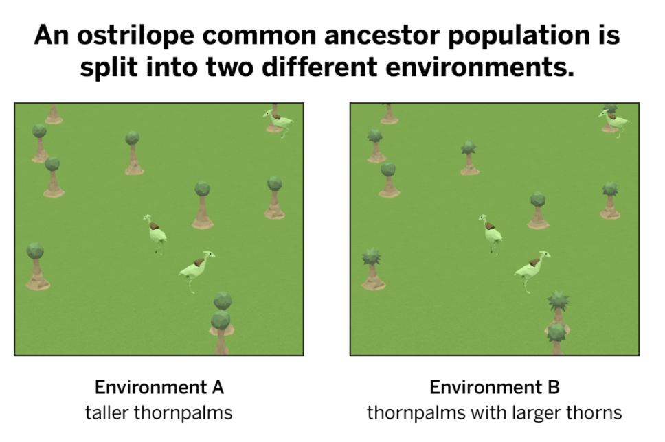 Model one of these environments in the Natural Selection Simulation, and you will both compare the descendant species that come from these two populations. First, predict whether each ostrilope population will change, and if so, how it will change.
