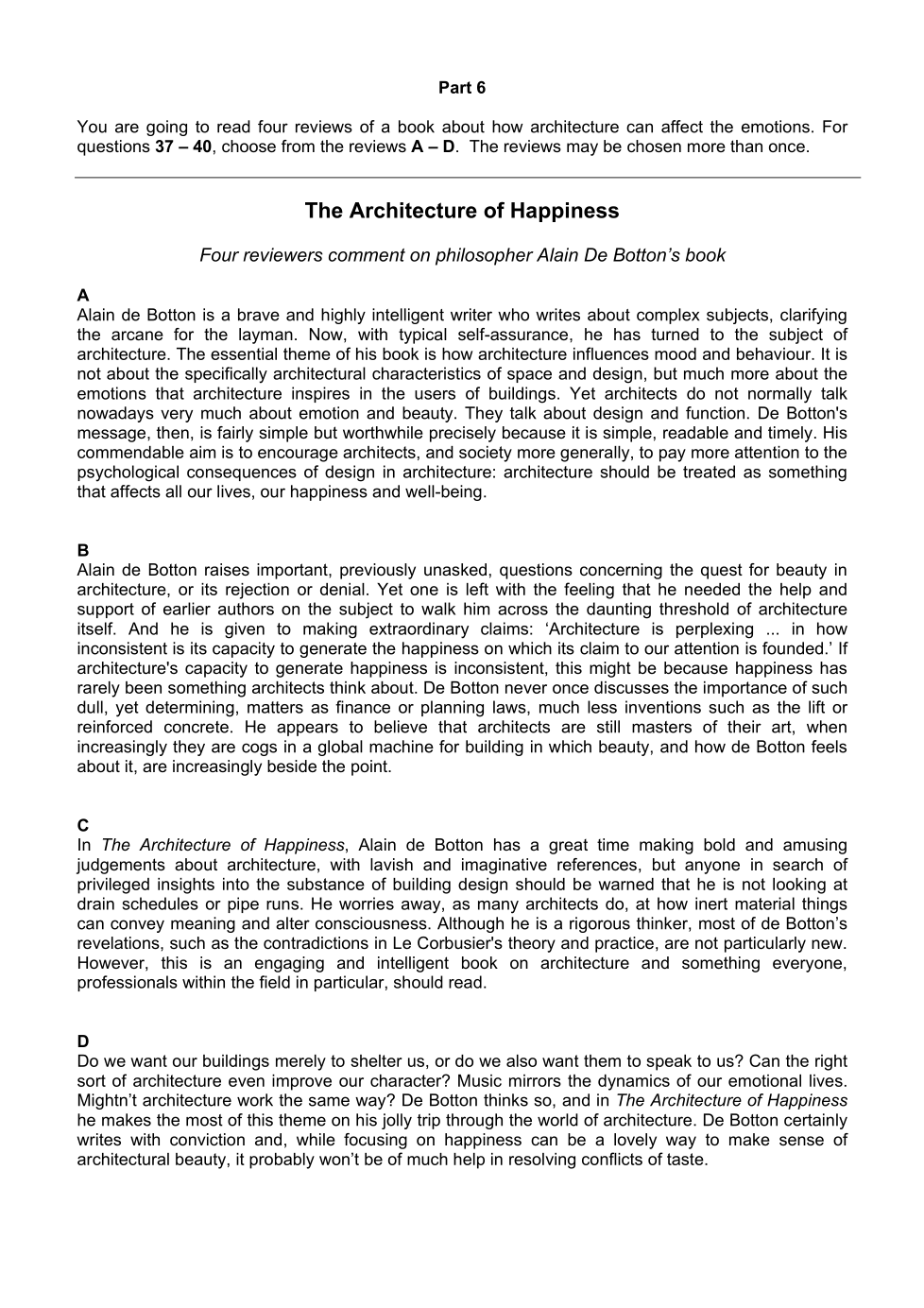 Which reviewer has a different opinion from the others on the confidence with which de Botton discussesarchitecture?
