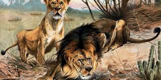 “You see, there are the lions, far over, that way. Now they’re on their way to the water hole. They’ve just been eating,” said Lydia. “I don’t know what.”