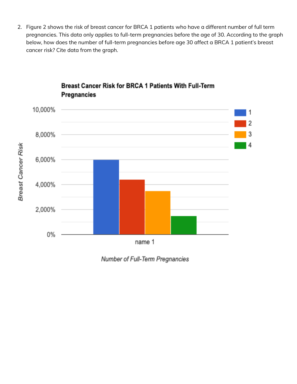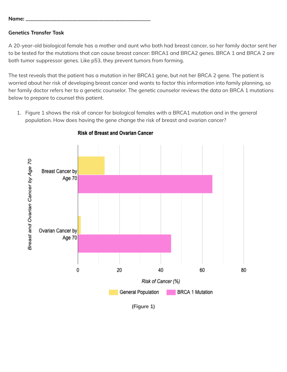 Figure 1 shows the risk of cancer for biological females with a BRCA1 mutation and in the general population. How does having the gene change the risk of breast and ovarian cancer.