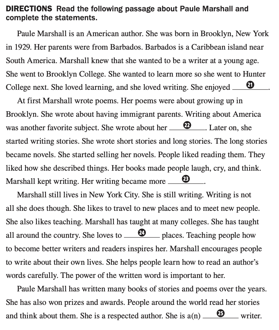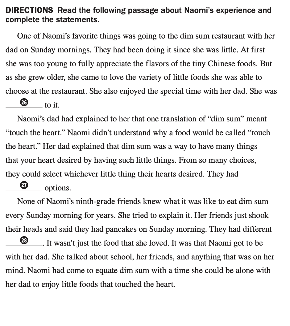 Lillian liked her project. She had spent hours reading about China. She had gone to the Asian market and bought chopsticks. She had cut beautiful pictures out of magazines. Her information was ready to be presented. But her stomach ached, and she wished her mother had let her stay home. As Mr. Murphy called her name, she took a deep breath. She walked to the front of the class. It was now time to face her fear of speaking in front of people.