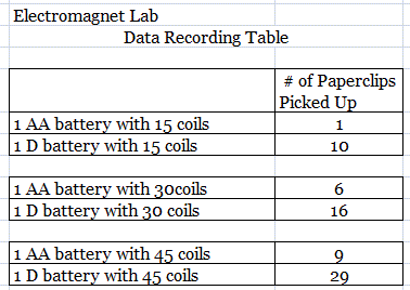 The strength of the electromagnet _____when we changed from a D battery to the AA Battery. When the D battery and 30 coils, the nail picked up ______paperclips. With the AA battery and 30 coils, the nail picked up _____ paperclips.
