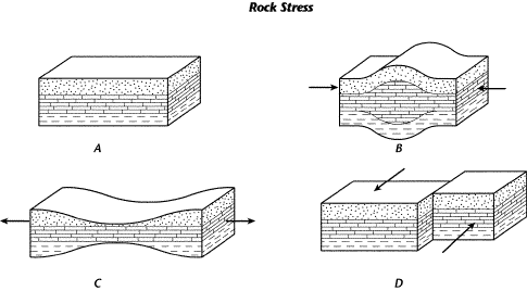 Using the above diagram, contrast the plate movements that cause the stresses in Diagrams B and C.