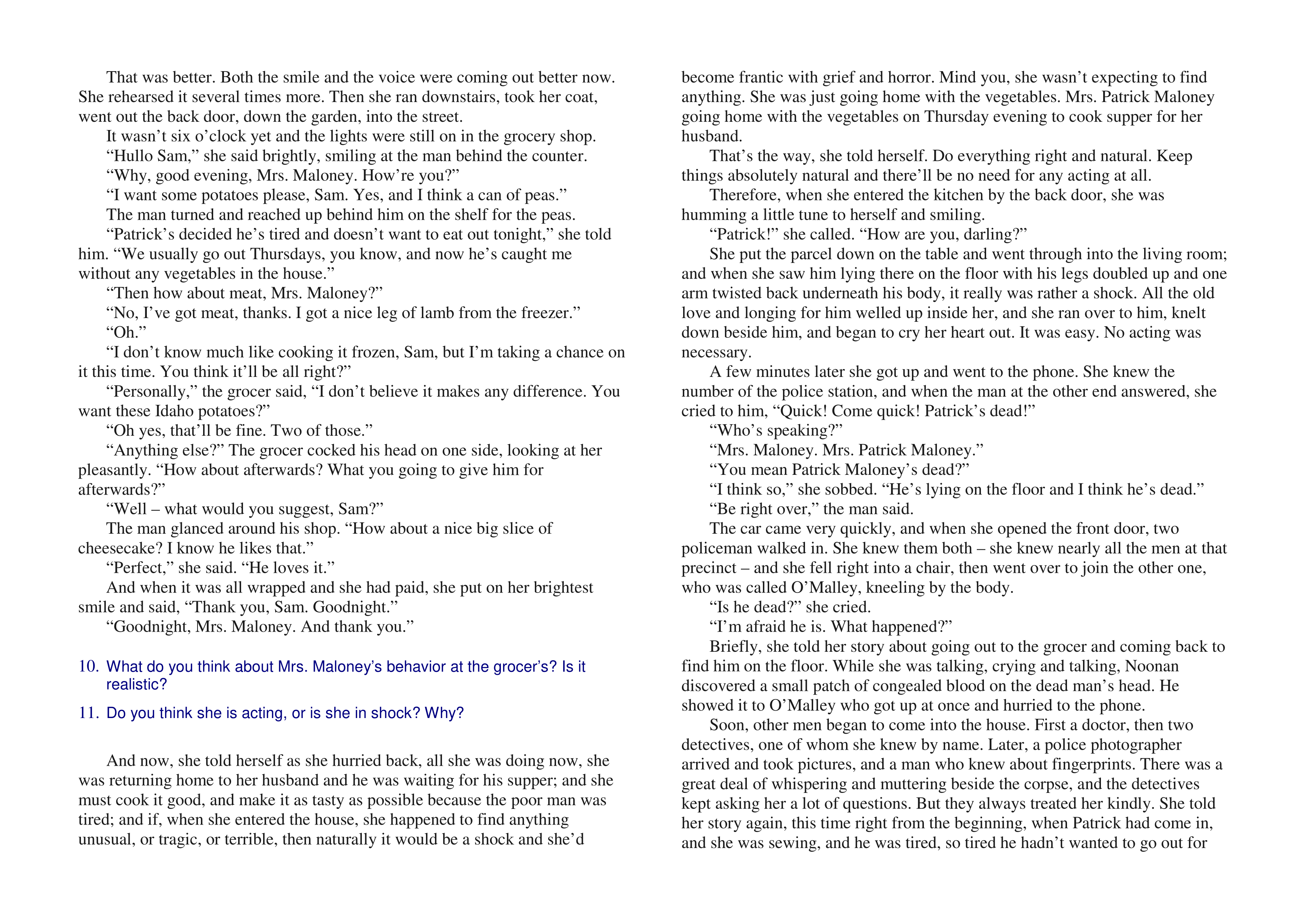 10. What do you think about Mrs. Maloney’s behavior at the grocer’s? Is itrealistic?