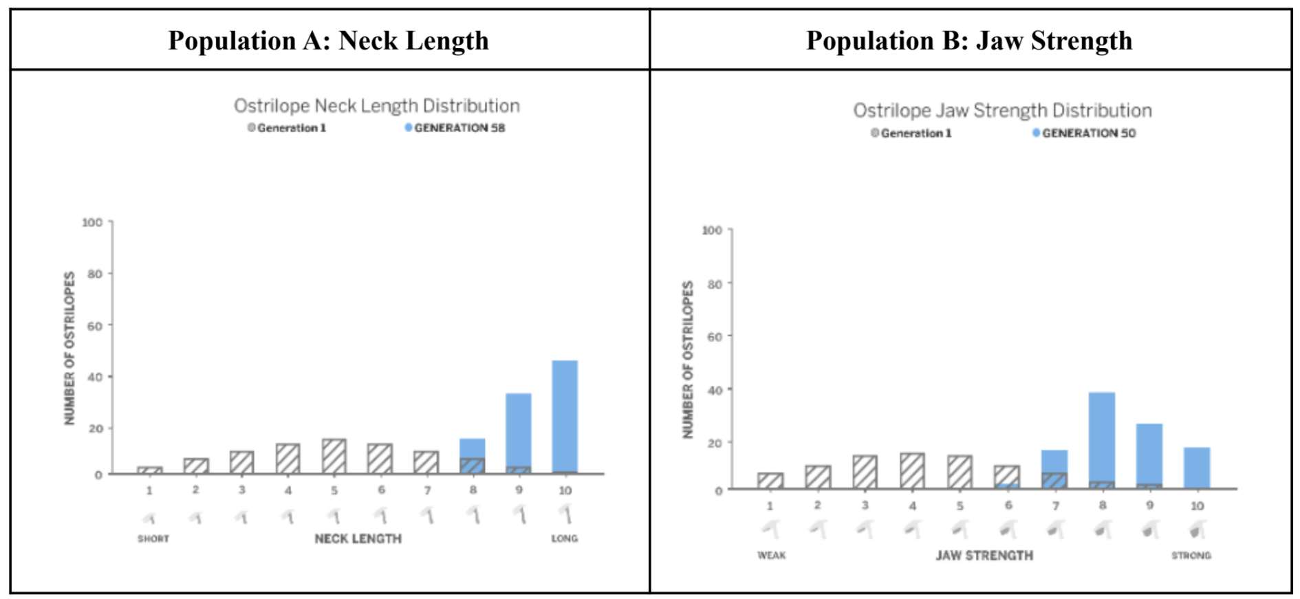 - Over 50 generations, Population A changed to have much longer necks.