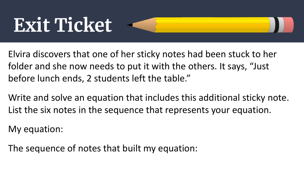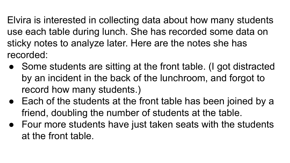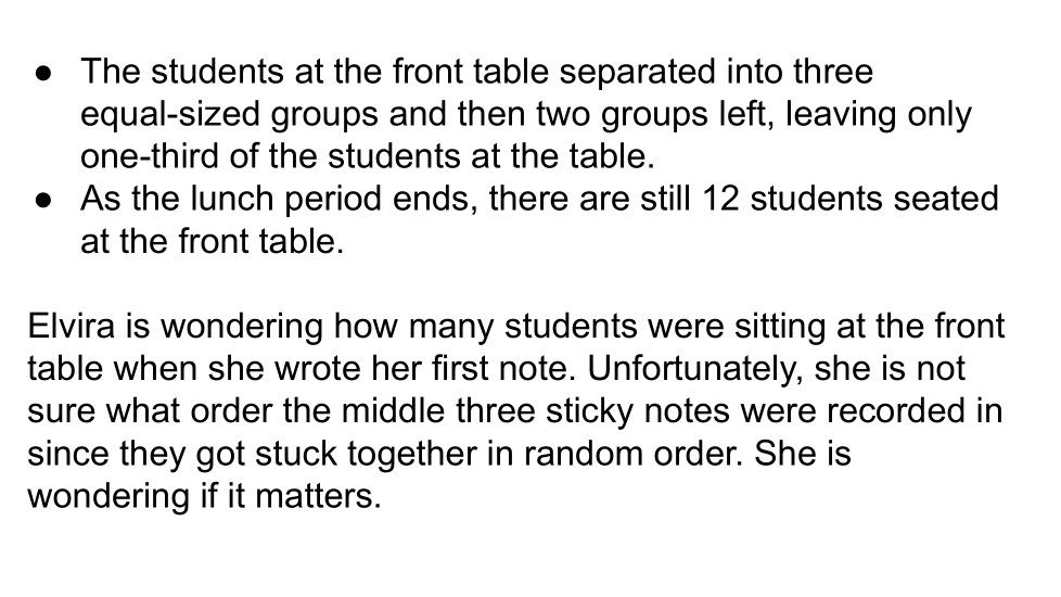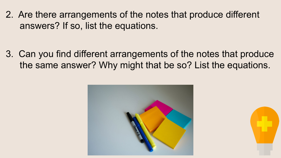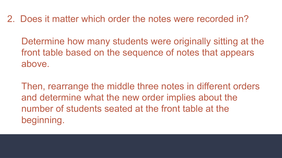 Luego, reorganice las tres notas del medio en diferentes órdenes y determine qué implica el nuevo orden sobre el número de estudiantes sentados en la mesa del frente al principio. Asegúrese de anotar qué respuesta coincide con qué orden.