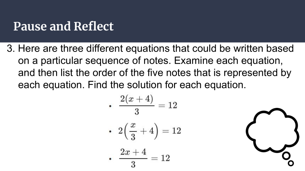 Aquí hay tres ecuaciones diferentes que podrían escribirse en función de una secuencia particular de notas. Examine cada ecuación y luego enumere el orden de las cinco notas que representa cada ecuación. Encuentre la solución para cada ecuación.