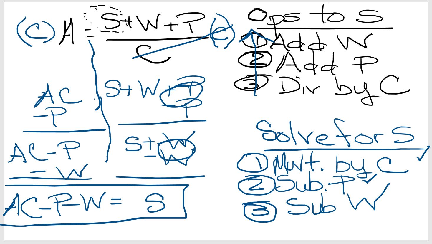 Usando lo que sabes sobre la manipulación de ecuaciones, resuelve esta ecuación para S. Tu solución tendrá la forma S = una expresión escrita en términos de las variables A, C, W y P.