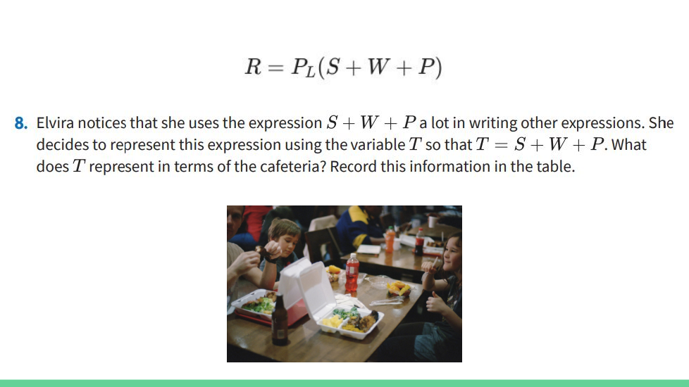 What does T represent in terms of the cafeteria? Record this information in the table. ¿Qué representa T en términos de la cafetería? Registra esta información en la tabla.