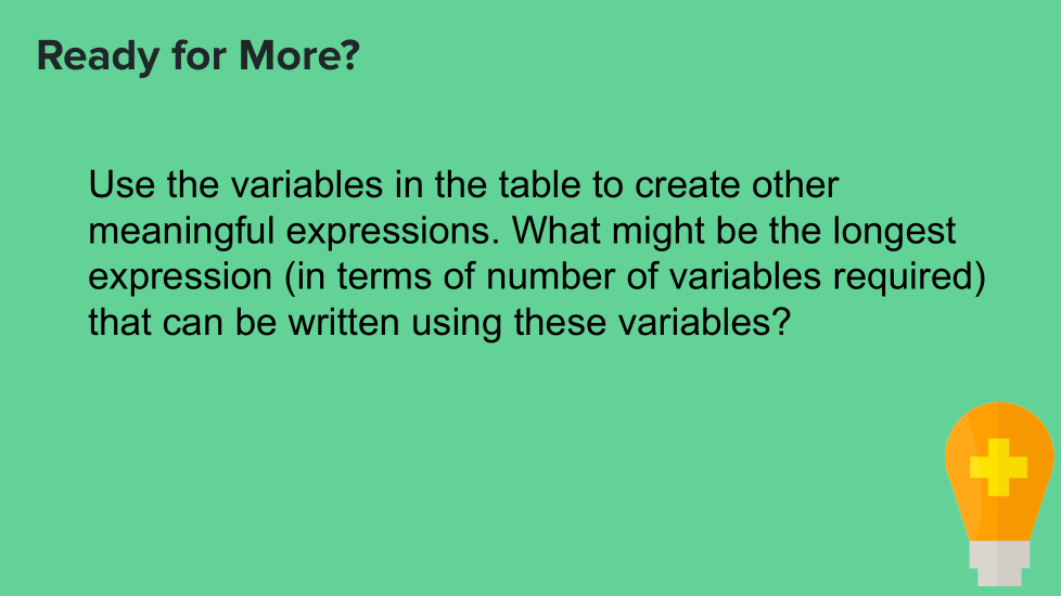 Utilice las variables de la tabla para crear otras expresiones significativas. ¿Cuál podría ser la expresión más larga (en términos del número de variables requeridas) que se puede escribir usando estas variables?