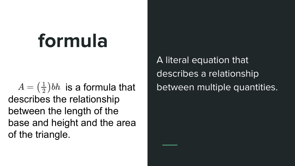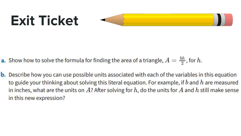 Describe cómo puedes usar las posibles unidades asociadas con cada una de las variables en esta ecuación para guiar tu pensamiento sobre cómo resolver esta ecuación literal. Por ejemplo, si b y h se miden en pulgadas, ¿cuáles son las unidades de A? Después de resolver para h, ¿todavía tienen sentido las unidades para A y h en esta nueva expresión?