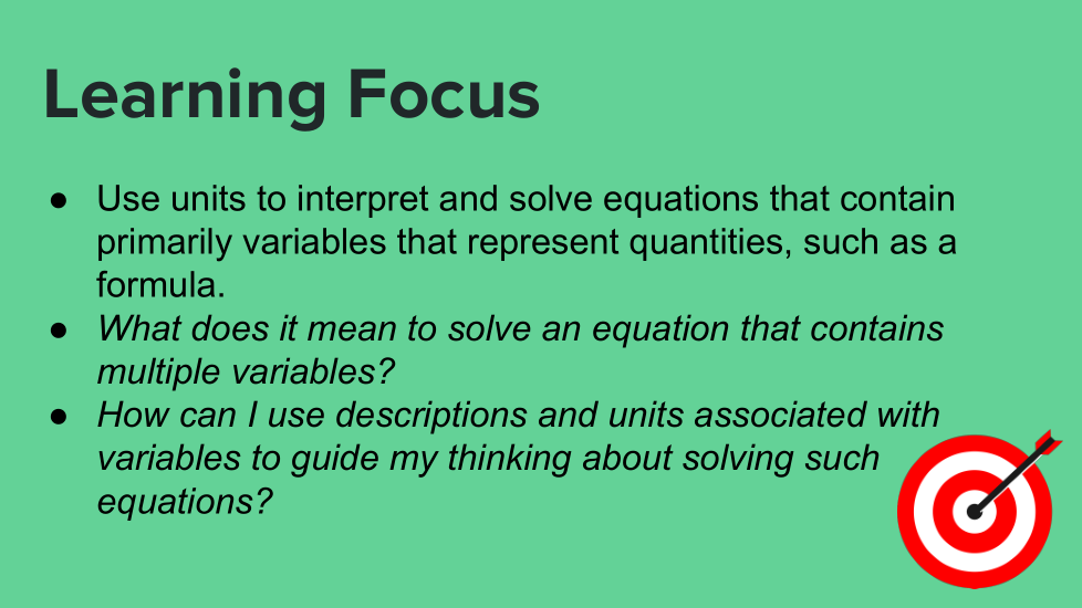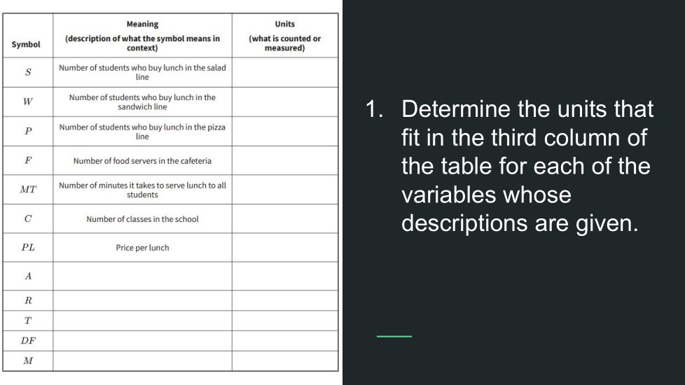 ¿Cómo puedo usar descripciones y unidades asociadas con variables para guiar mi pensamiento sobre cómo resolver tales ecuaciones?