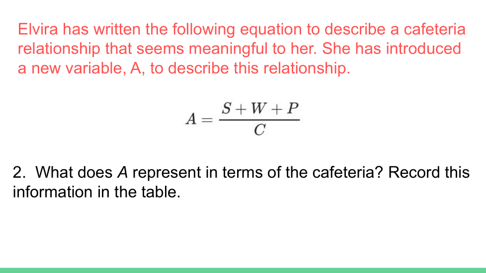 What does A represent in terms of the cafeteria? Record this information in the table.
