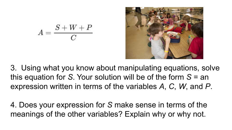 Kwa kutumia unachojua kuhusu kuchezea milinganyo, suluhisha mlinganyo huu wa S. Suluhisho lako litakuwa la umbo S = usemi ulioandikwa kulingana na viambajengo A, C, W, na P.