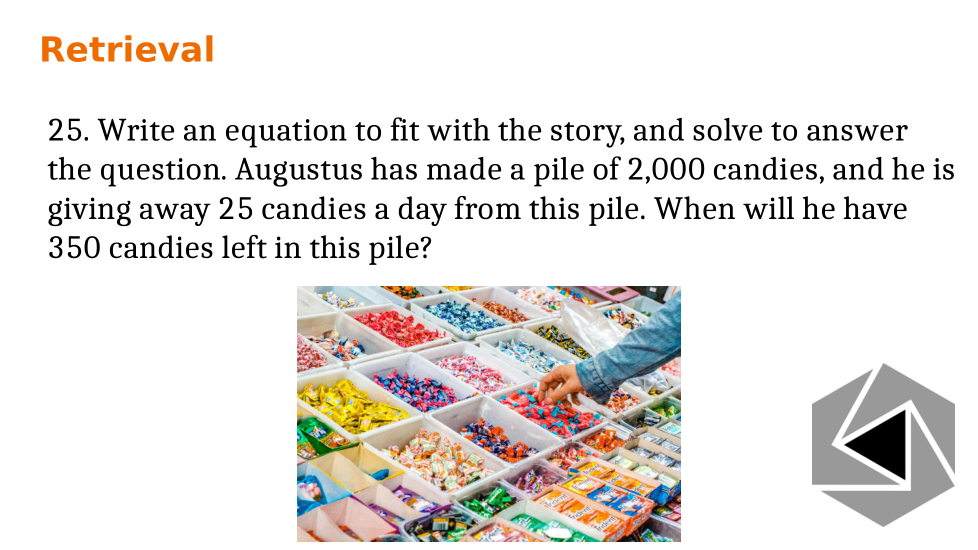 Augustus ha hecho una pila de 2,000 dulces y está regalando 25 dulces al día de esta pila. ¿Cuándo le quedarán 350 dulces en esta pila?
