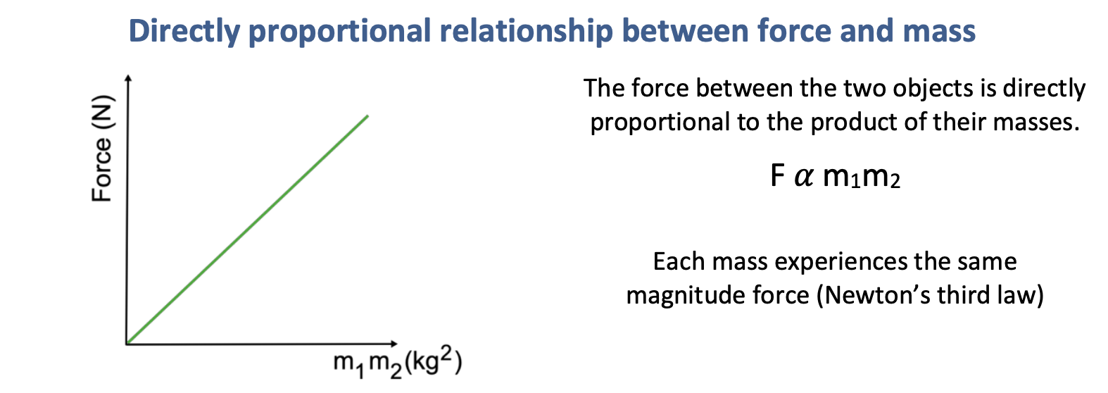 Note the mathematical relationship between gravitational force and the product of the masses: