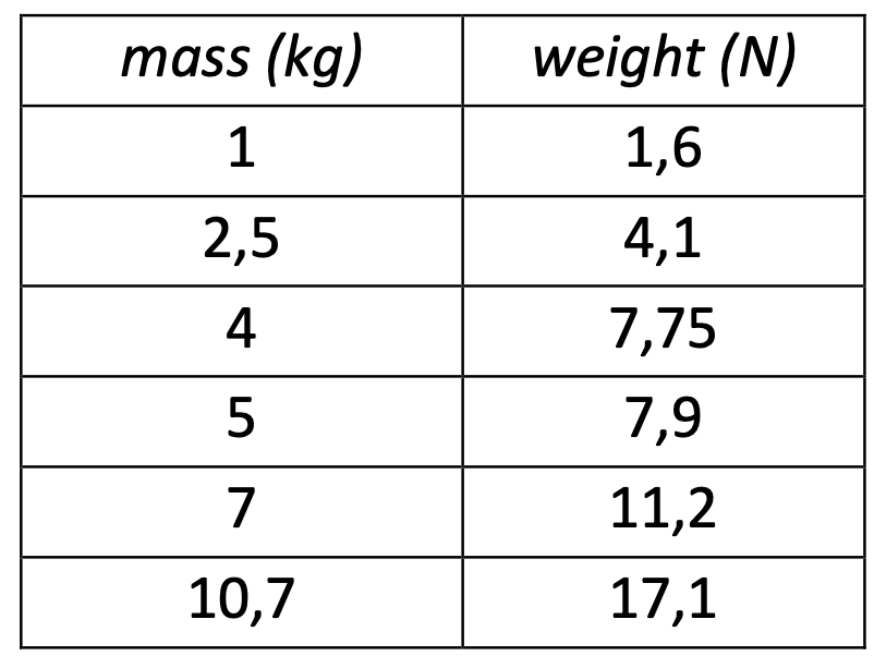 The following data was collected on a particular planet during an investigation to calculate the acceleration due to gravity (g) on that planet. The weight of each mass was measured and the results were recorded in the table below: