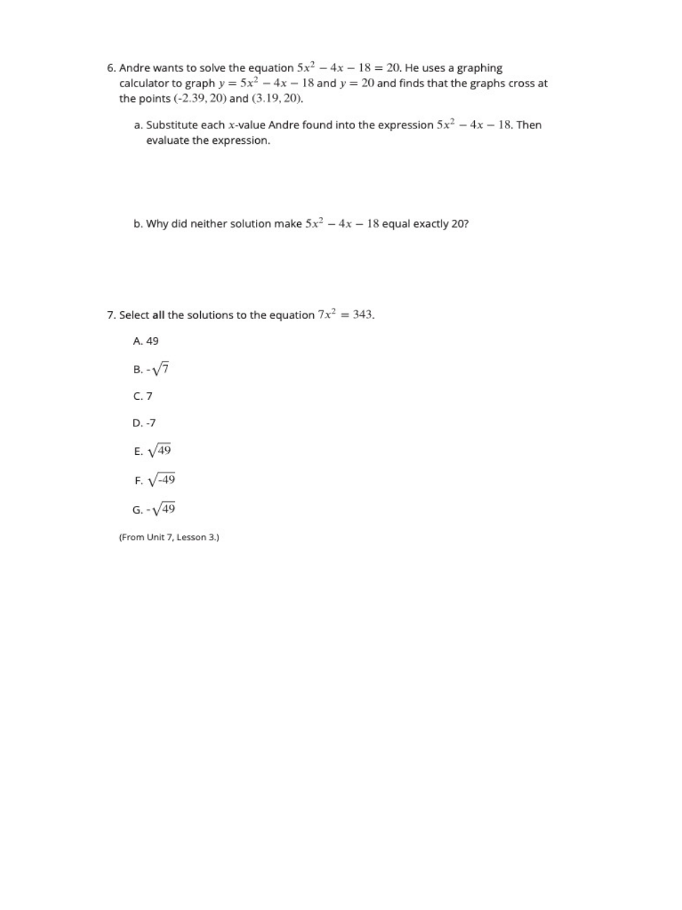 Select all the solutions to the equation 7x2 = 343.