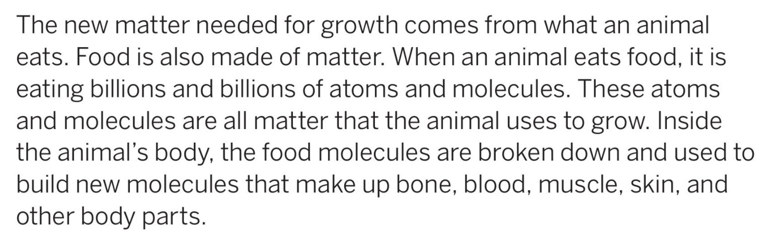 Animals need matter to grow. Which sentence explains where this matter come from?