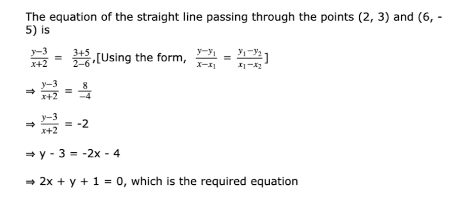 Find the equation of the straight line passing through the points (2, 3) and (6, - 5).