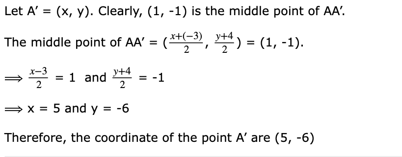Find the point A’ if the point A (-3, 4) on reflection in the point (1, -1) maps onto the point A’.