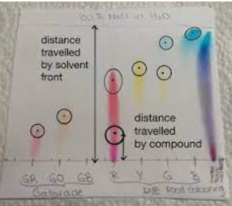 The image below represents a student sample for the separation of dyes in a process known at chromatography. Use your knowledge of chromatography from our 4.1 lab to answer the questions that follow