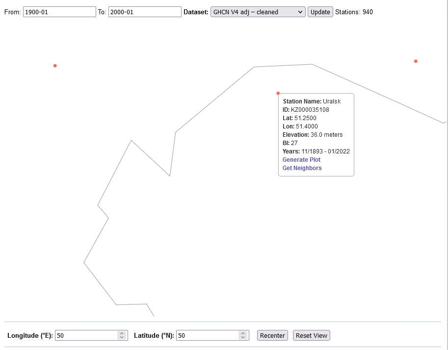 You should see a table of temperatures. The very last column to the right is labeled as "metANN" and is the "meteorological annual mean". Enter the meteorological annual mean temperature of your station in 1900 below.