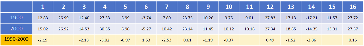 Here is the data from student # 1-16. Each column represents a single location, with the mean temperature in 1900 in row 1 and the mean temperature in 2000 in row 2.