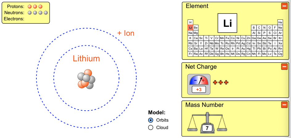 Lithium has 3 protons (+) charges. How many electrons (-) must be added to make it neutral?
