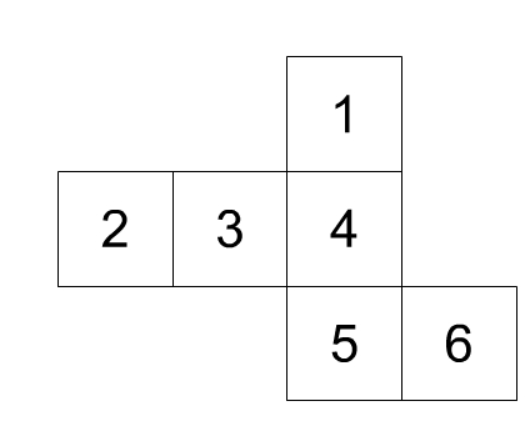 A figura representa a planificação de um cubo. Se o 6 está na face superior do cubo, qual é o número que está na face inferior? Indica apenas o valor numérico.