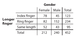 Find the relative frequency of a male having a longer ring finger. (give your answer using a % symbol round to the whole % (no decimals) )