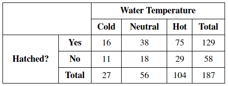 How is the hatching of water python eggs influenced by the temperature of the snake’s nest? Researchers randomly assigned newly laid eggs to one of three water temperatures: hot, neutral, or cold. Hot duplicates the extra warmth provided by the mother python, and cold duplicates the absence of the mother. The two-way table summarizes the data on whether or not the eggs hatched.