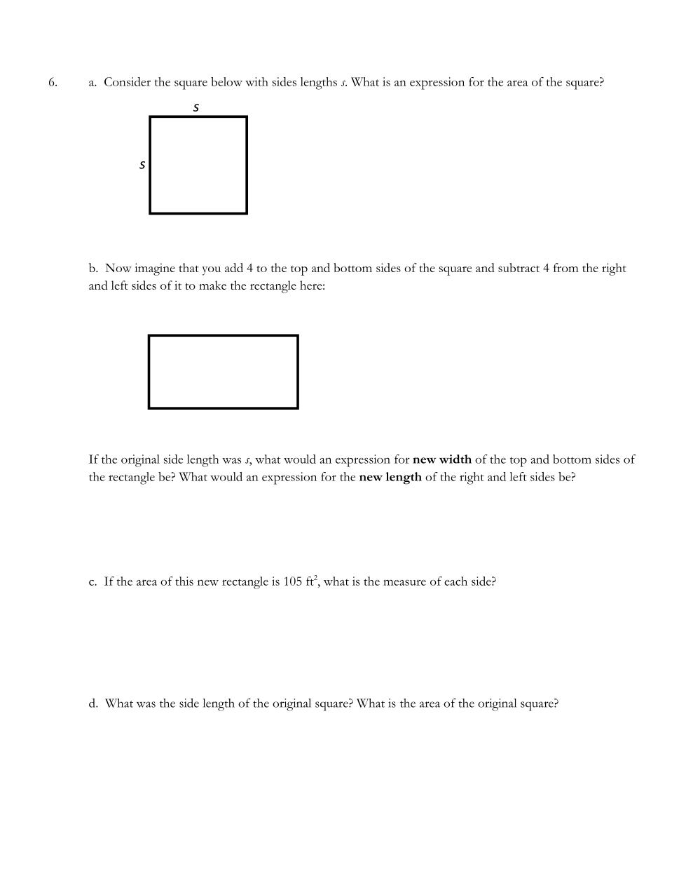 If the area of this new rectangle is 105 ft2, what is an equation that used to find each side length?
