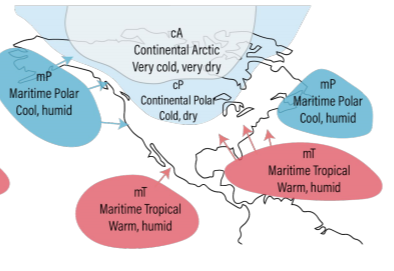 A body of air extending over a large area (1,000 miles or more) that develops and retains specific characteristics of pressure, temperature, and humidity