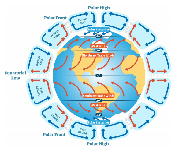 Winds that act as a heat transfer system due to the unequal heating of Earth’s surface