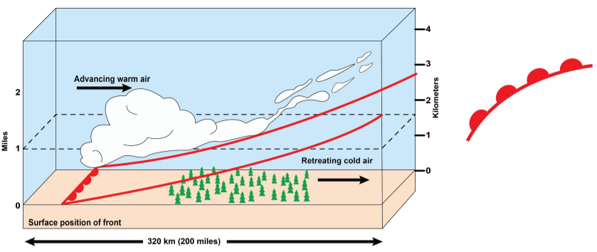 The boundary between an advancing warm air mass and a receding cooler air mass