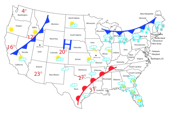 A map or chart that shows the weather conditions at a specific point in time over a specific region