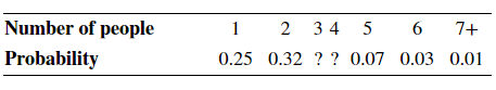 In government data, a household consists of all occupants of a dwelling unit. Choose an American household at random and count the number of people it contains. Here is the assignment of probabilities for the outcome. The probability of finding 3 people in a household is the same as the probability of finding 4 people.