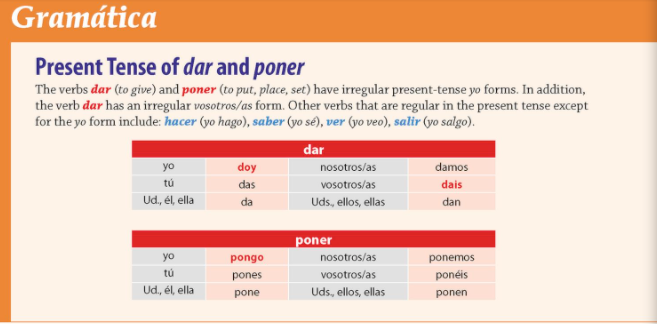 En el verano yo siempre _______ (dar) un paseo por la playa. Yo _______ (salir) en la mañana a nadar. En la tarde mi mamá y yo _______ (salir) a buscar flores. Cuando llegamos a casa yo _______ (poner) las flores por toda la casa. En la noche mi hermano y yo _______ (dar) un paseo por la plaza con mi hermana. Mi padre nos _______ (dar) dinero para ir de compras. Cuando nosotros _______ (llegar) a casa, _______ (poner) la mesa para comer cena con la familia. Mi abuela _______ (hacer) comida muy deliciosa. Mi hermana _______ (poner) flores en el centro de la mesa para que se vea bonito. Me _______ (gustar) mucho el verano.