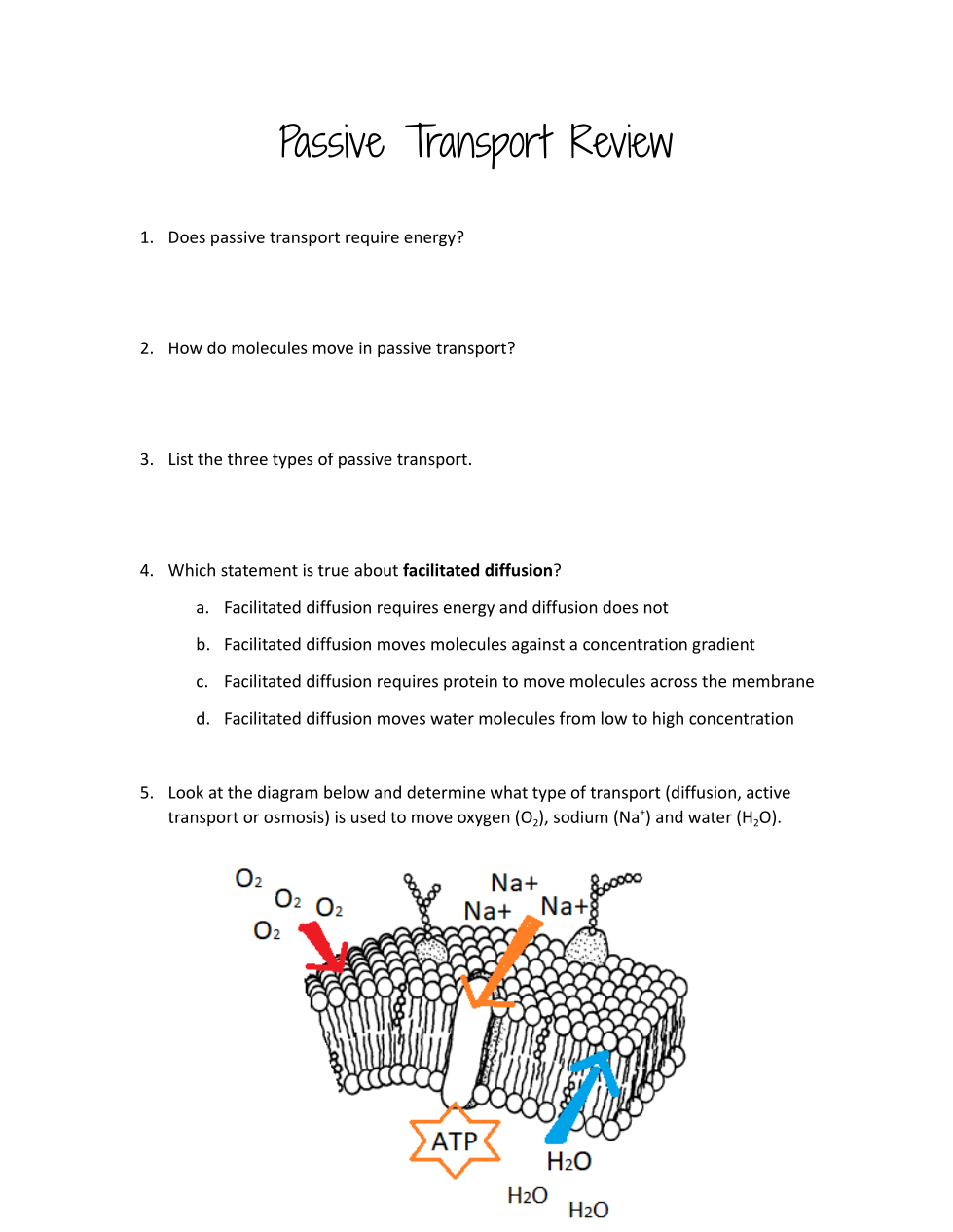 Look at the diagram, what type of transport is moving H2O across the membrane. Water is moving from high to low without using a protein? HINT: Energy is needed