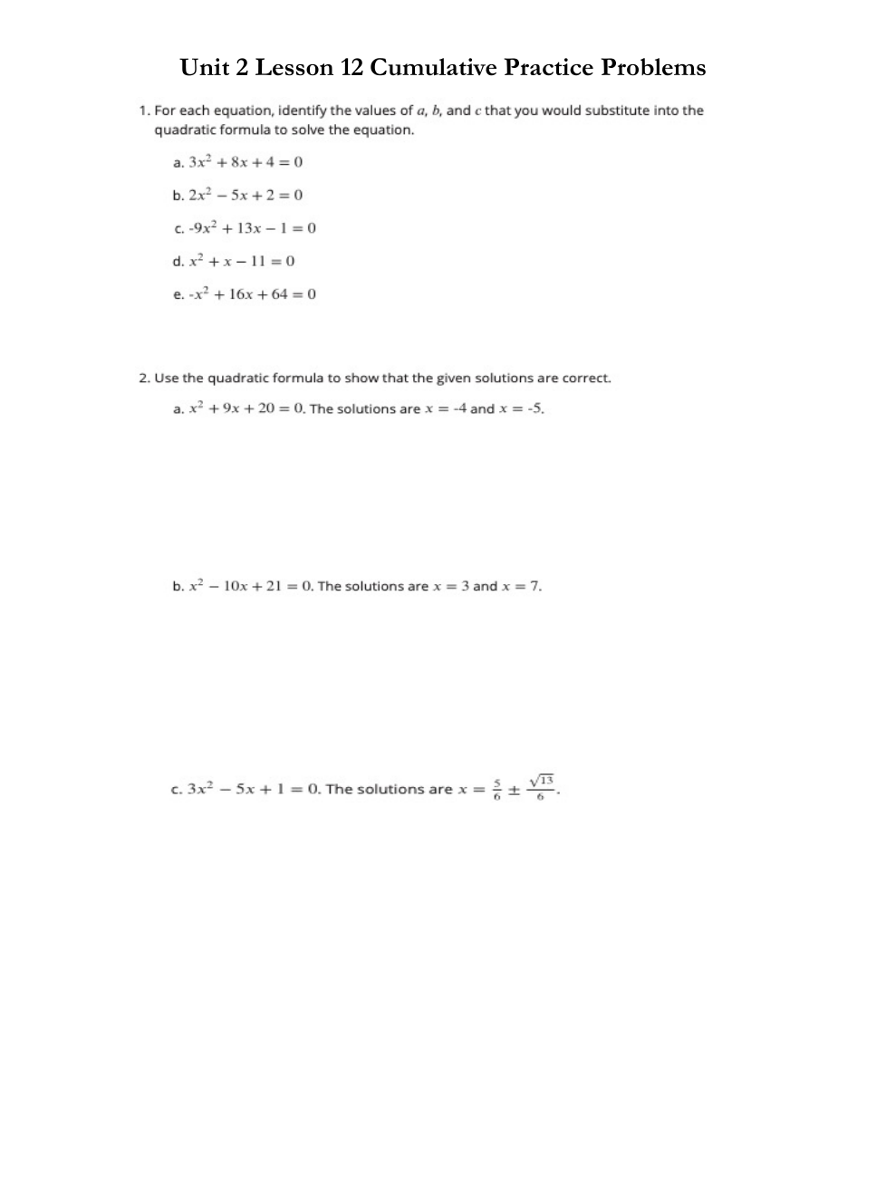 Us the Quadratic Formula to show that the solutions to the equation x2 - 10x + 21 = 0 are x = 3 and x = 7.