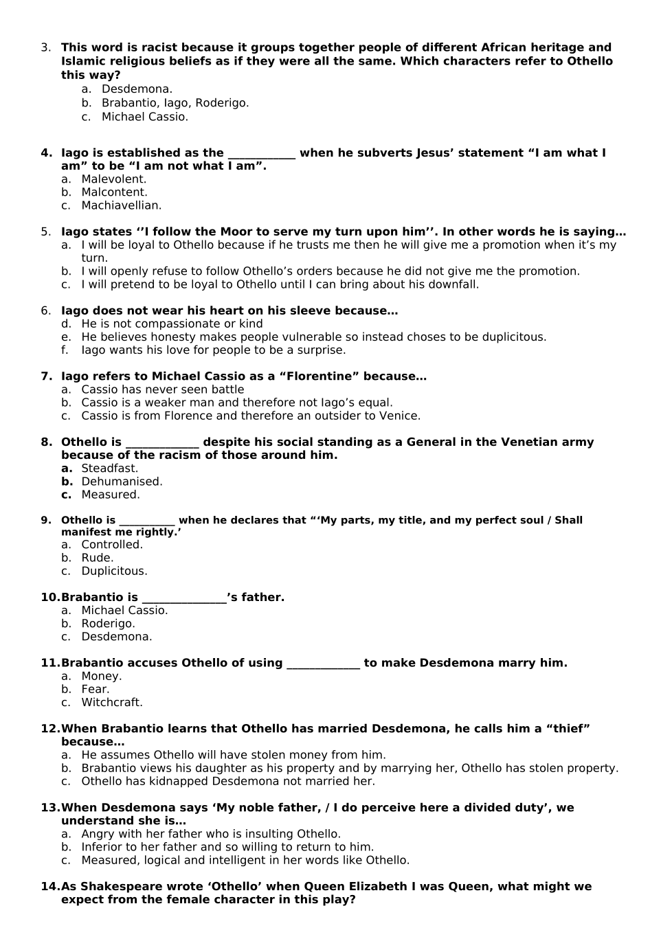This word is racist because it groups together people of different African heritage and Islamic reliious beliefs as it they were all the same. Which characters refers to Othello this way